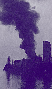 Montreux Casino’s entertainment complex caught fire during a concert Zappa and the band played on December 4, 1971, when some idiot fired a flare gun into the ceiling, which was covered with a flammable rattan surface. The entire complex burnt down, taking with it all the instruments and equipment belonging to the band. As the smoke billowed out across Lake Geneva, it was observed by the members of Deep Purple, who had arrived in Montreux that evening to begin recording their next album.
